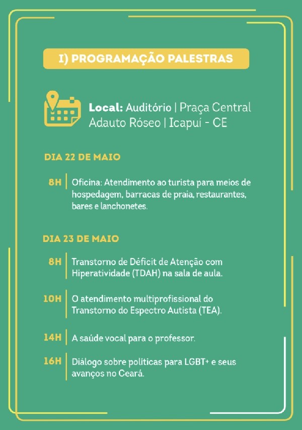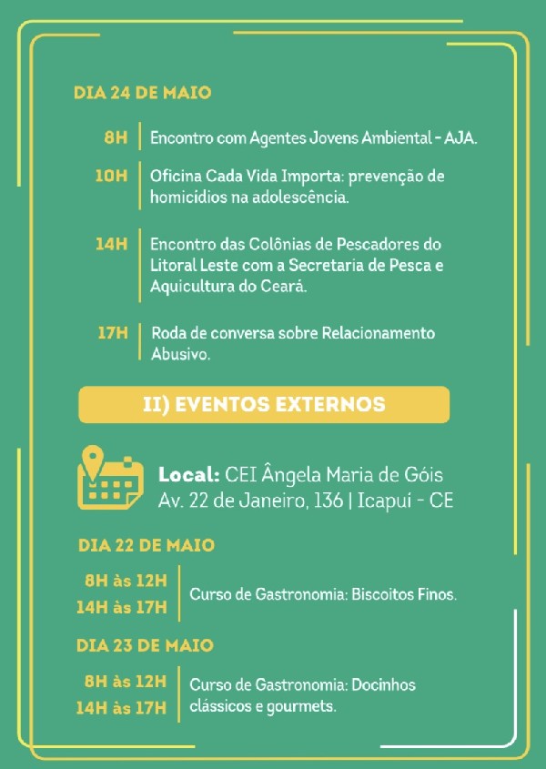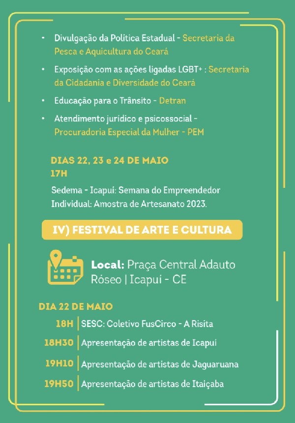 O Festival de Arte e Cultura, coordenado pelo Conselho de Altos Estudos e Assuntos Estratégicos, ocorrerá de 22 a 24, com o intuito de promover a apresentação de trabalhos produzidos por artistas locais e incentivar o surgimento de novos talentos da região. Grupos musicais, comediantes e artistas de Aracati, Beberibe, Fortim, Icapuí, Itaiçaba e Jaguaruana marcarão presença.