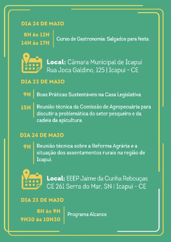 Aqui na Câmara Municipal, amanhã, dia 23, às 9h, será realizada oficina sobre Boas Práticas Sustentáveis na Casa Legislativa, e às 15h, Reunião técnica para discutir a problemática do setor pesqueiro e da cadeia de apicultura. Já na quarta-feira, dia 24, teremos uma Audiência técnica da Comissão de Agropecuária sobre a Reforma Agrária e a situação dos assentamentos rurais na região de Icapuí.