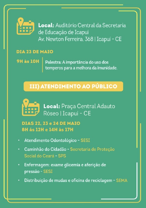 A Feira de Serviços e Cidadania acontecerá de 22 a 24 e oferecerá palestras educativas, oficinas e serviços como odontologia, enfermagem, distribuição de mudas e emissão de documentos. O Caminhão da Cidadania estará localizado na praça central, proporcionando comodidade para os participantes.