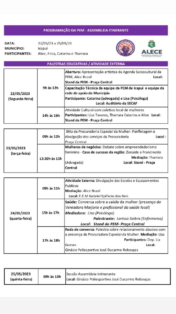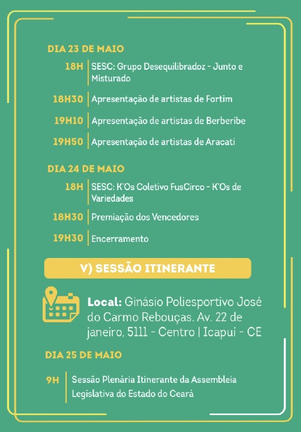 De 22 a 25 de maio, a região do Litoral Leste será palco da Assembleia Itinerante, realizada pelo Poder Legislativo Estadual em Icapuí. O evento trará diversas atividades para a comunidade, incluindo a Feira de Serviços e Cidadania, o II Festival de Arte e Cultura e uma sessão plenária com a presença dos deputados estaduais.